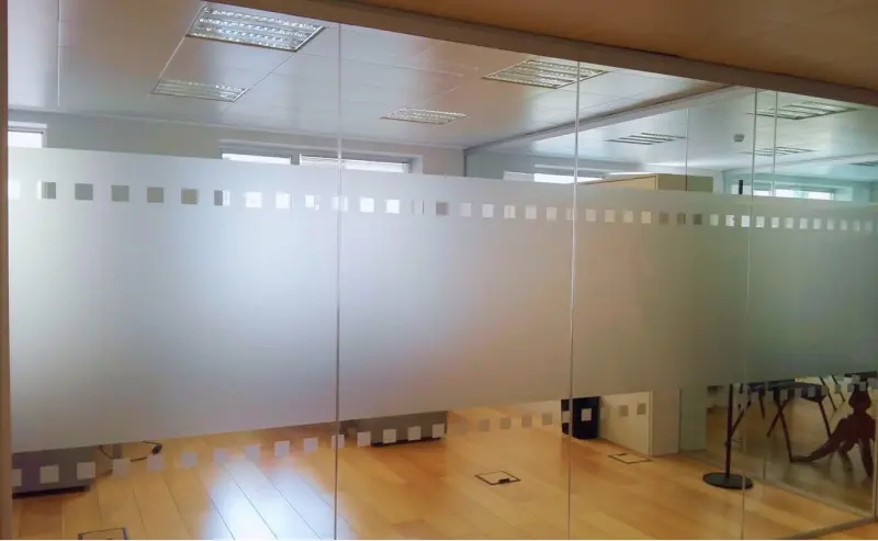 Instalación de vinilo ácido y vinilo de corte en cristaleras de oficina para privacidad y branding.