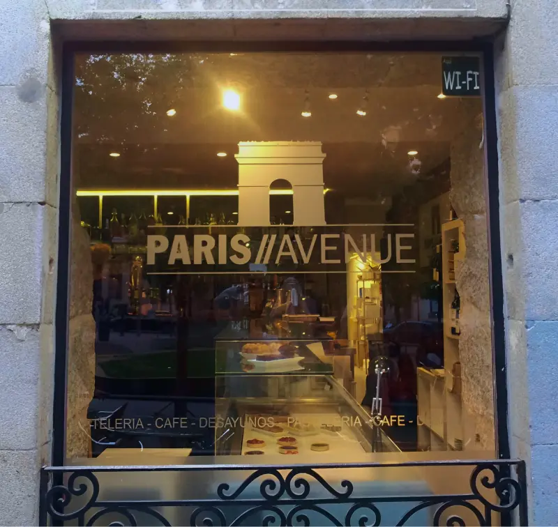 Boceto y aplicación de vinilo de corte para escaparate de cafetería.
